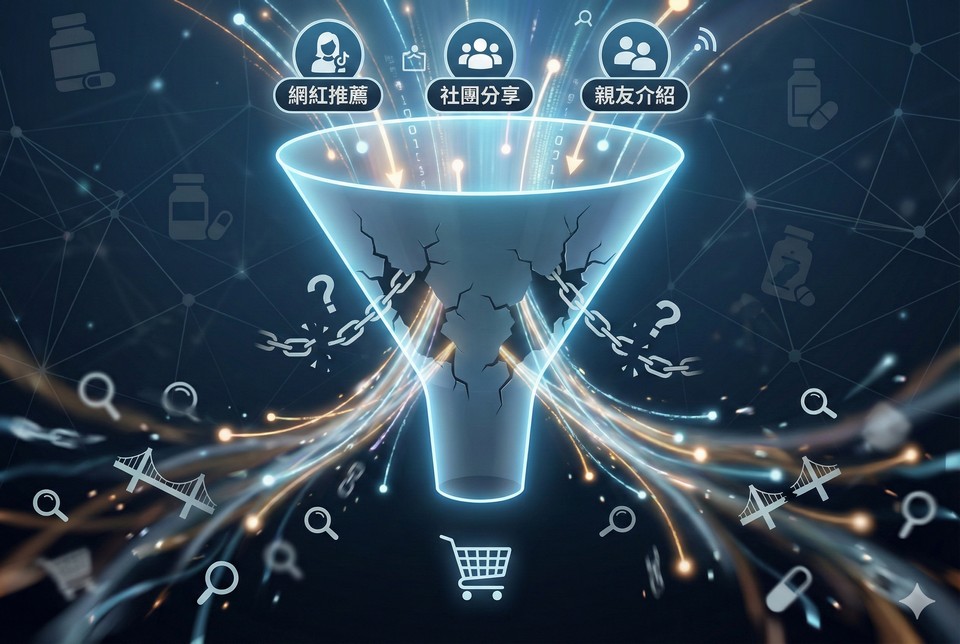 漏斗一般指稱行銷線性流程,但在保健食品業卻呈現出更複雜心理決策軌跡。前期擴散即使能引發大量關注,若未能有效承接後續驗證需求,消費者便會在漏斗中流失。保健食品業口碑行銷常見高聲量、低轉換現象,是因品牌忽視信任建構與決策推進等核心節點。特別是在法規限制下,品牌無法直接訴求療效,更需倚賴多點式驗證內容,協助消費者在比對過程中快速獲得信心,而非僅停留在曝光層。